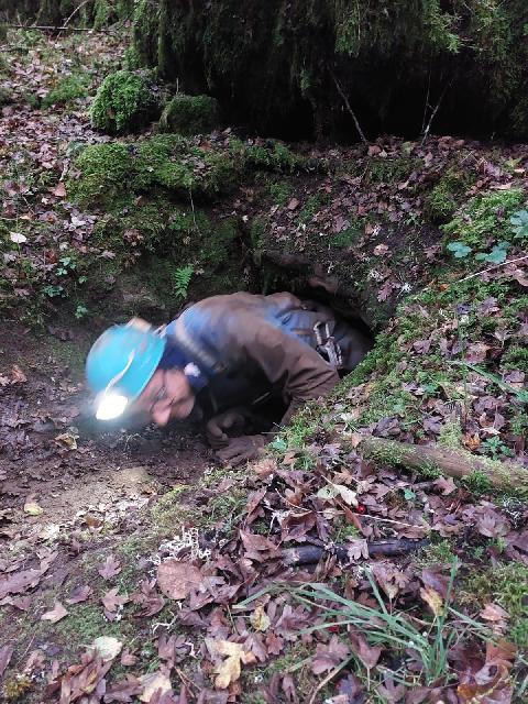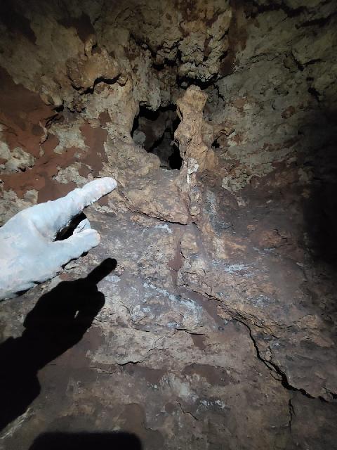 S’ensuit un asticotage d’une dizaine de mètres, pour finalement déboucher dans une petite salle « taille humaine » (on peut enfin se tenir debout !). Et bonne nouvelle : ça souffle bien ici, très encourageant. En bas, un trou béant donne sur le P40 — on doit être sur un total d’au moins P50 depuis cette salle.