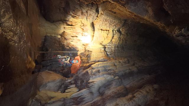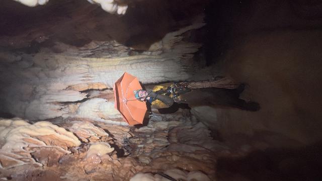 un parapluie ! Faible encombrement, pratique et léger …. Arrêt sur trémie pas bien méchante et on voit à travers les blocs que ça continue avec un courant d’air sensible.