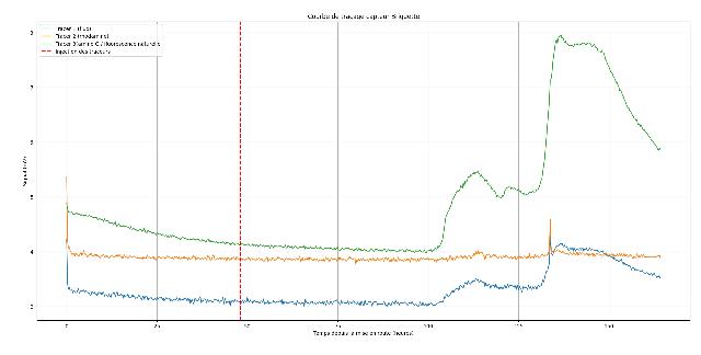 Concernant le capteur extérieur, on observe dans les deux heures suivant l’injection quelques petits pics, mais rien de suffisamment net pour être interprété comme un passage de traceur. Ces variations sont compatibles avec :